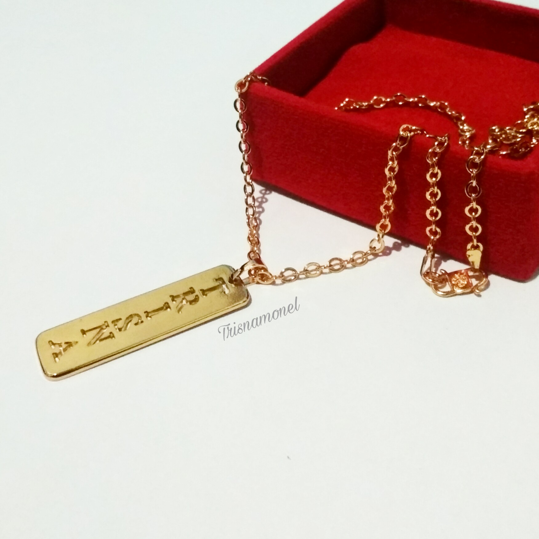* GOLD : Dibuat dari bahan kuningan dengan ketebalan 1 seperempat mm yang di lapisi emas/ disepuh emas yang dikombinasi rantai titanium dengan ukuran 0,5 mm yang divariasi dengan hiasan lonceng dan love.
