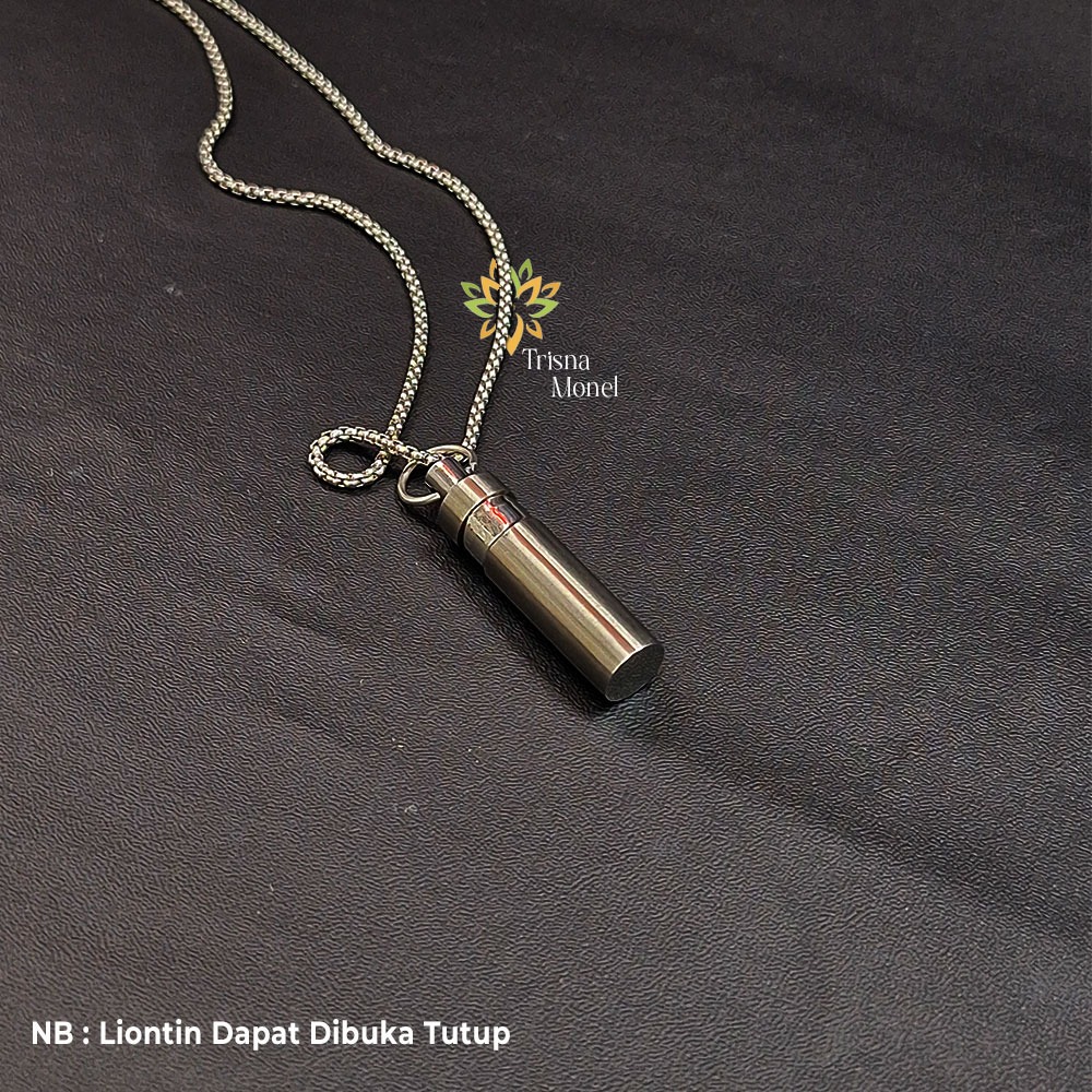 Produk liontin tersebut dibuat dari bahan monel asli anti karat yang dikombinasi dengan kalung titanium motif rolo anti karat.
