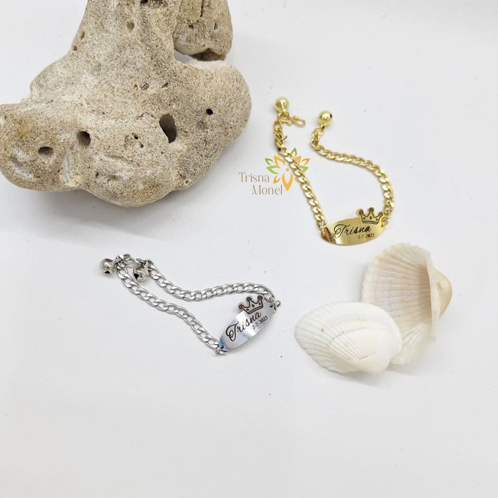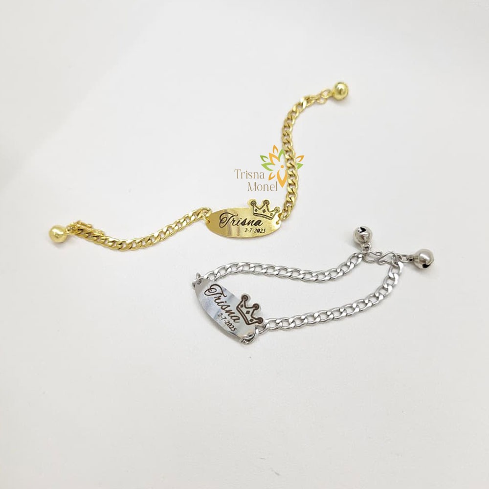 - Gold : Dibuat dari bahan kuningan dengan ketebalan bahan 1 ml yang kami lapisi warna kuning emas/sepuh emas yang kami kombinasi dengan rantai titanium berkualitas.