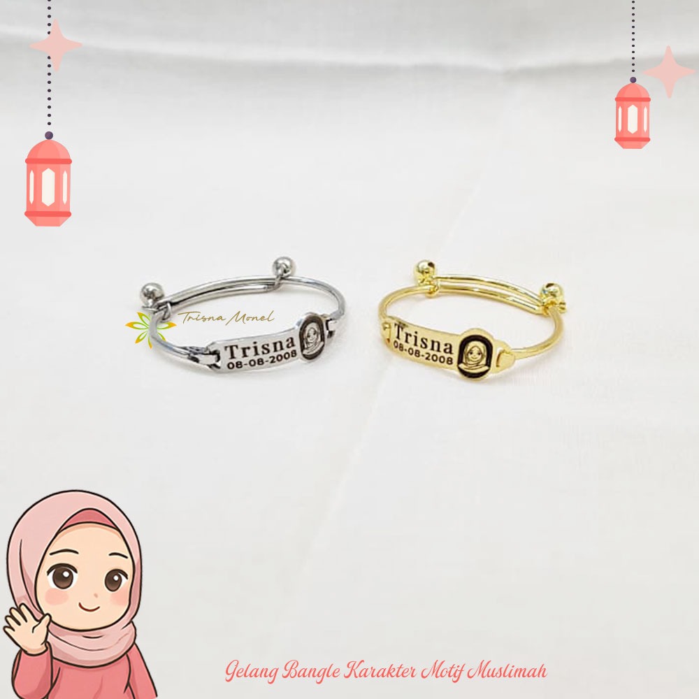 Adjustable free gelang monel !!! gelang karakter ukir nama size anak sampai dewasa motif kartun muslimah