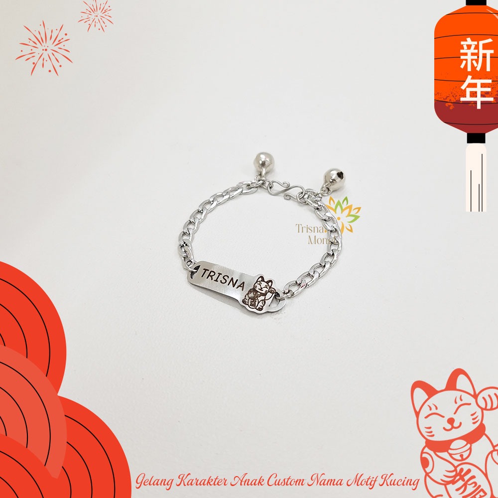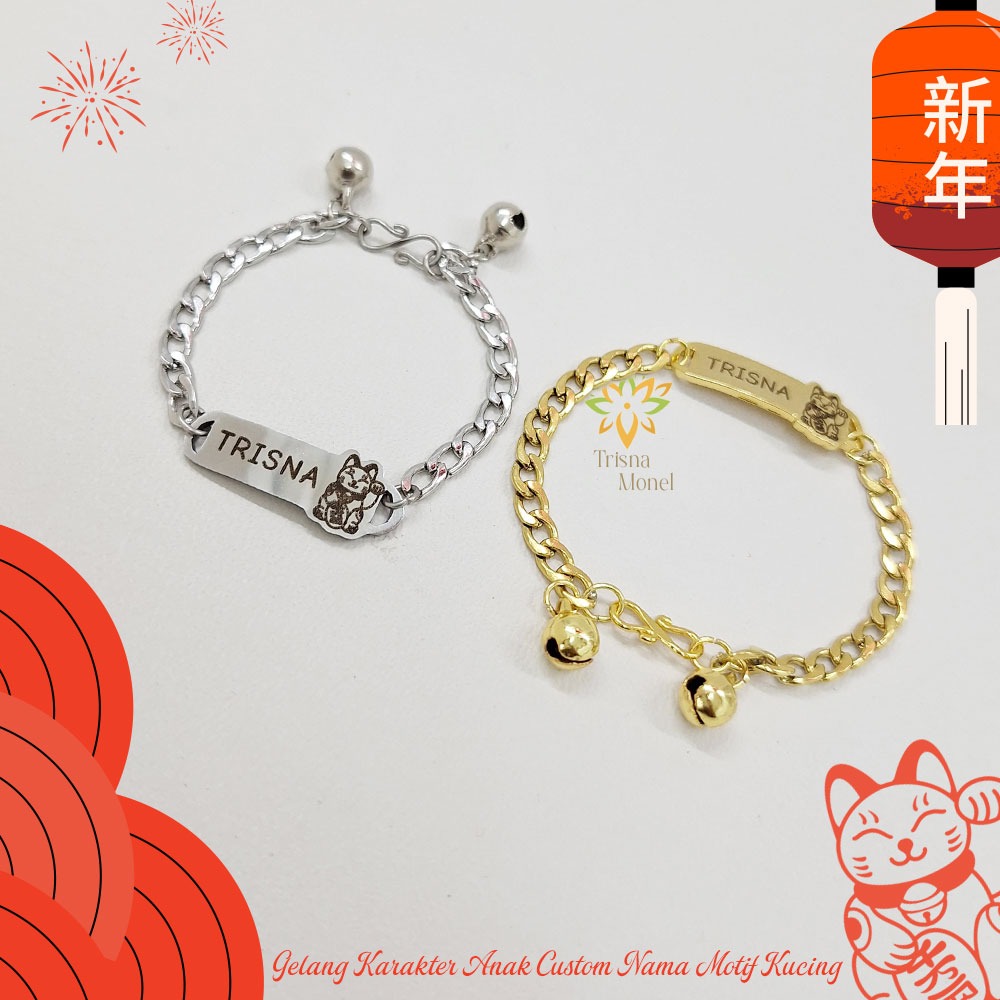 GELANG CUSTOM NAMA ANAK KARAKTER MOTIF KUCING GOLD DAN SILVER MURAH