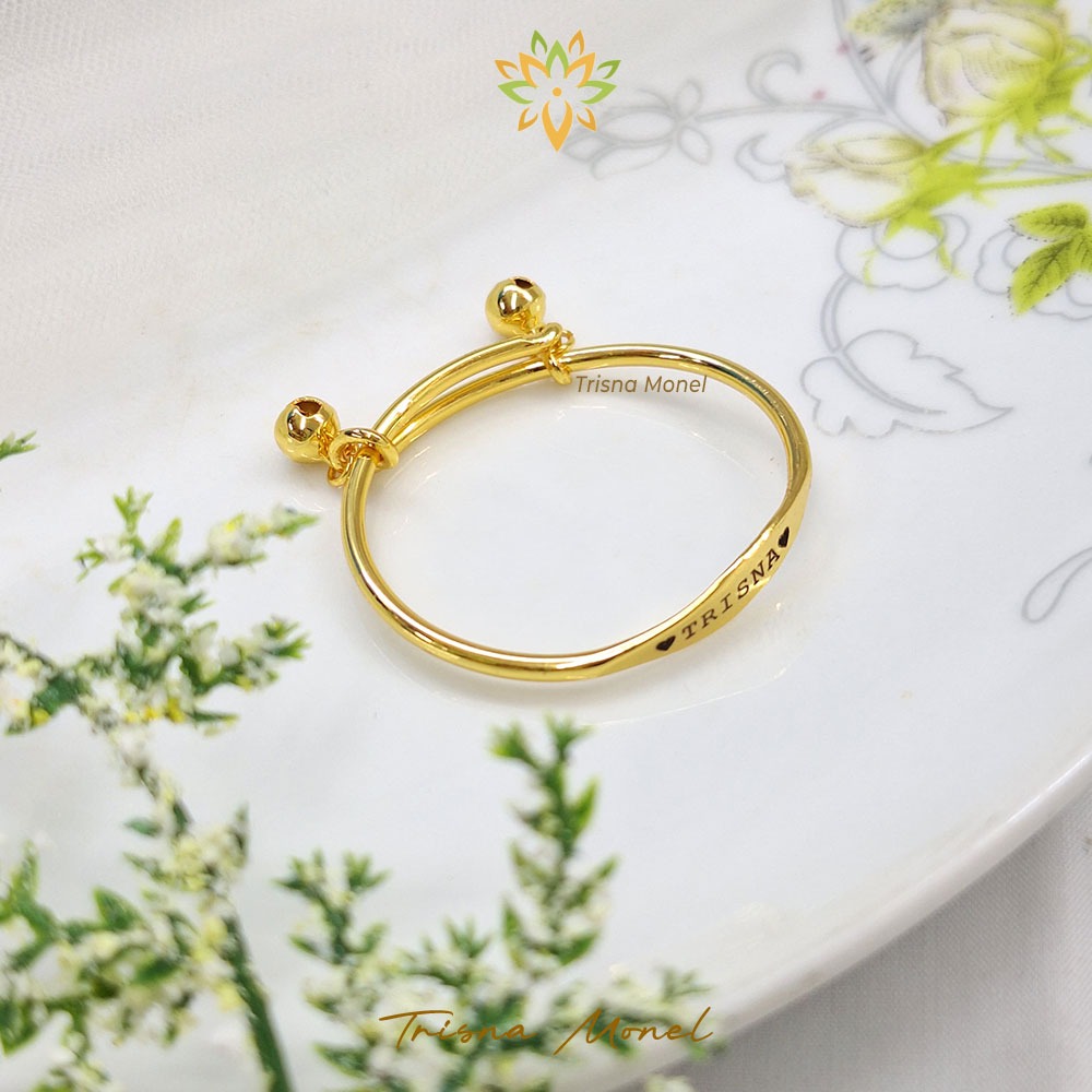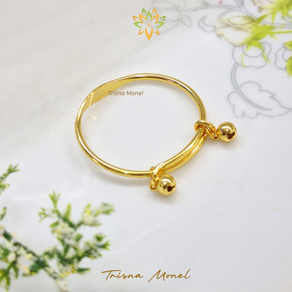 Gelang motif diatas dibuat dari bahan kuningan murni dengan ketebalan bahan 2 ml yang divariasi dengan lonceng/ bel dengan ukuran diameter 6 ml yang dilapisi emas /disepuh emas yang kami coating atau kami lapisi anti gores, sehingga produk tersebut menjadi lebih awet dan tidak mudah pudar..