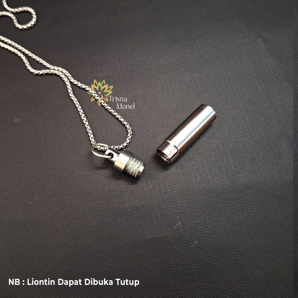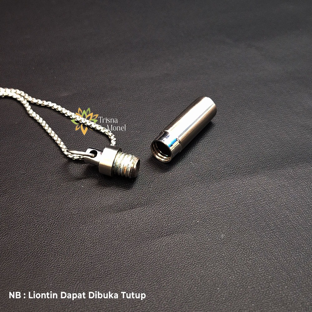 Produk liontin tersebut dibuat dari bahan monel asli anti karat yang dikombinasi dengan kalung titanium motif rolo anti karat.