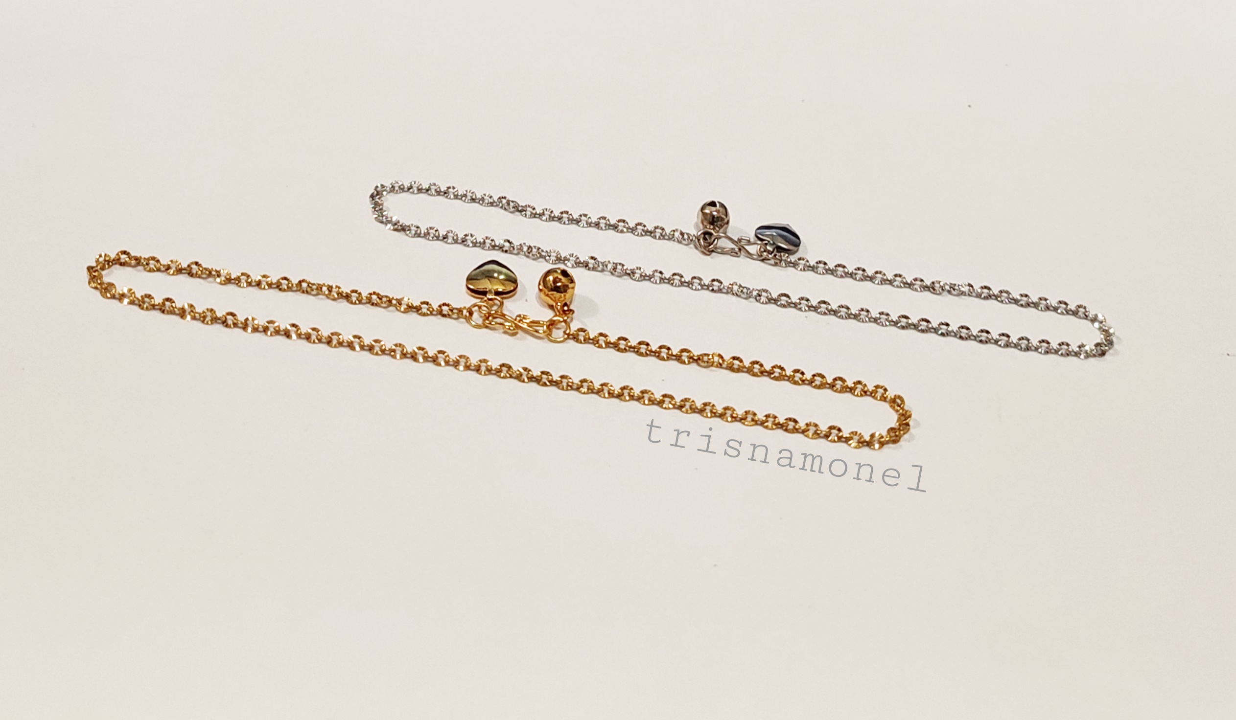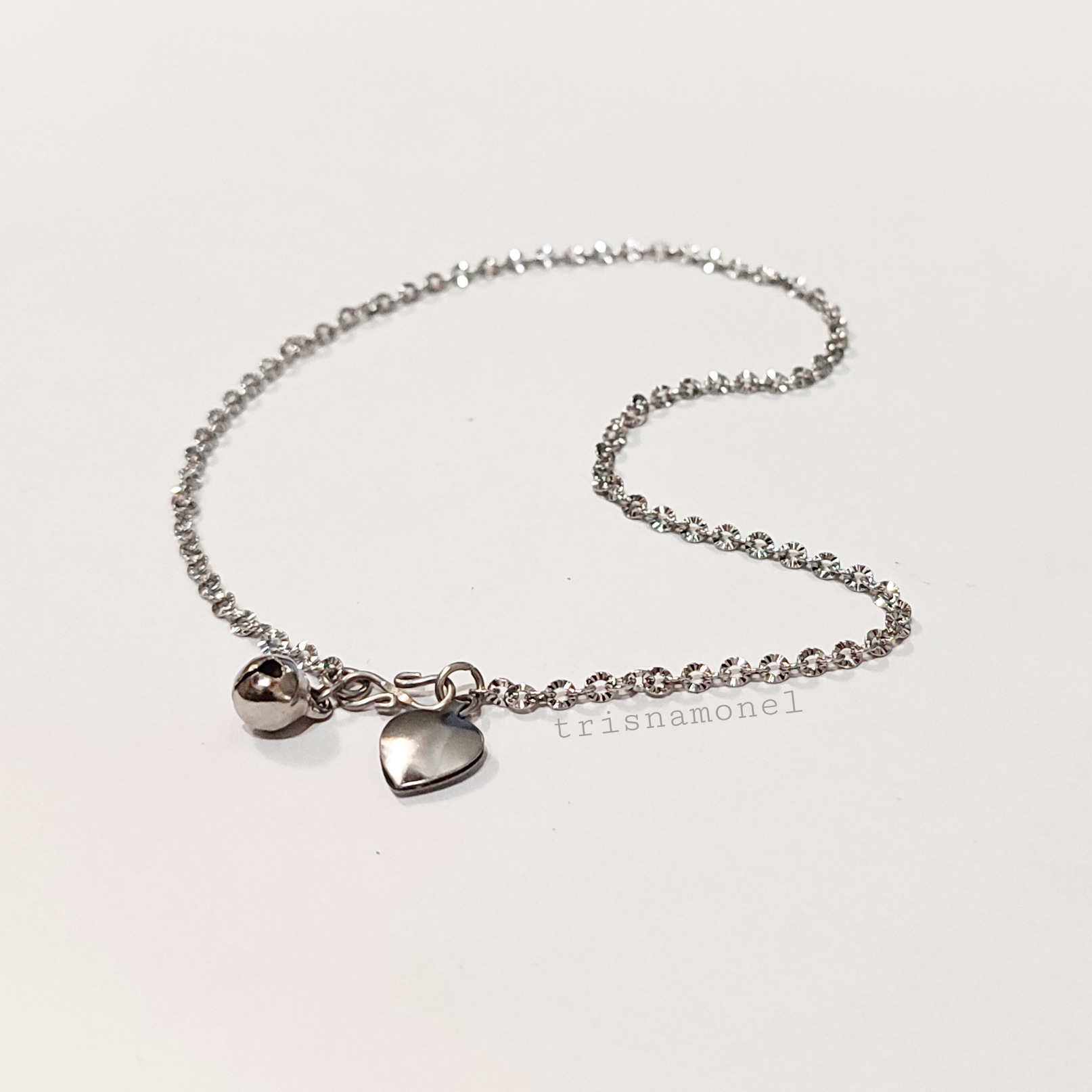 Produk gelang kaki diatas dibuat dari Titanium anti karat dengan ketebalan 0,5 mm yang divariasi dengan lonceng dan love.