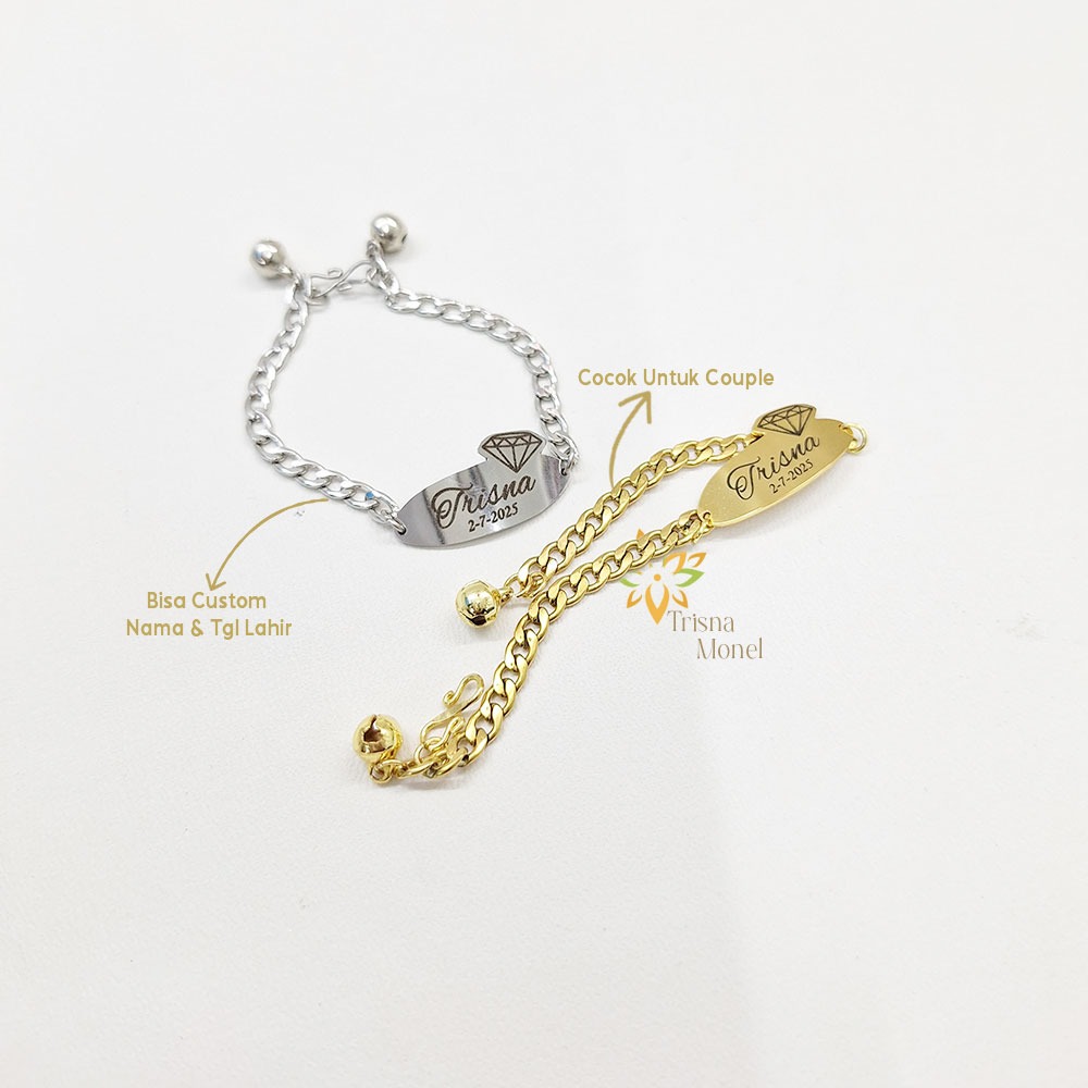 - Gold : Dibuat dari bahan kuningan dengan ketebalan bahan 1 ml yang kami lapisi warna kuning emas/sepuh emas yang kami kombinasi dengan rantai titanium berkualitas.