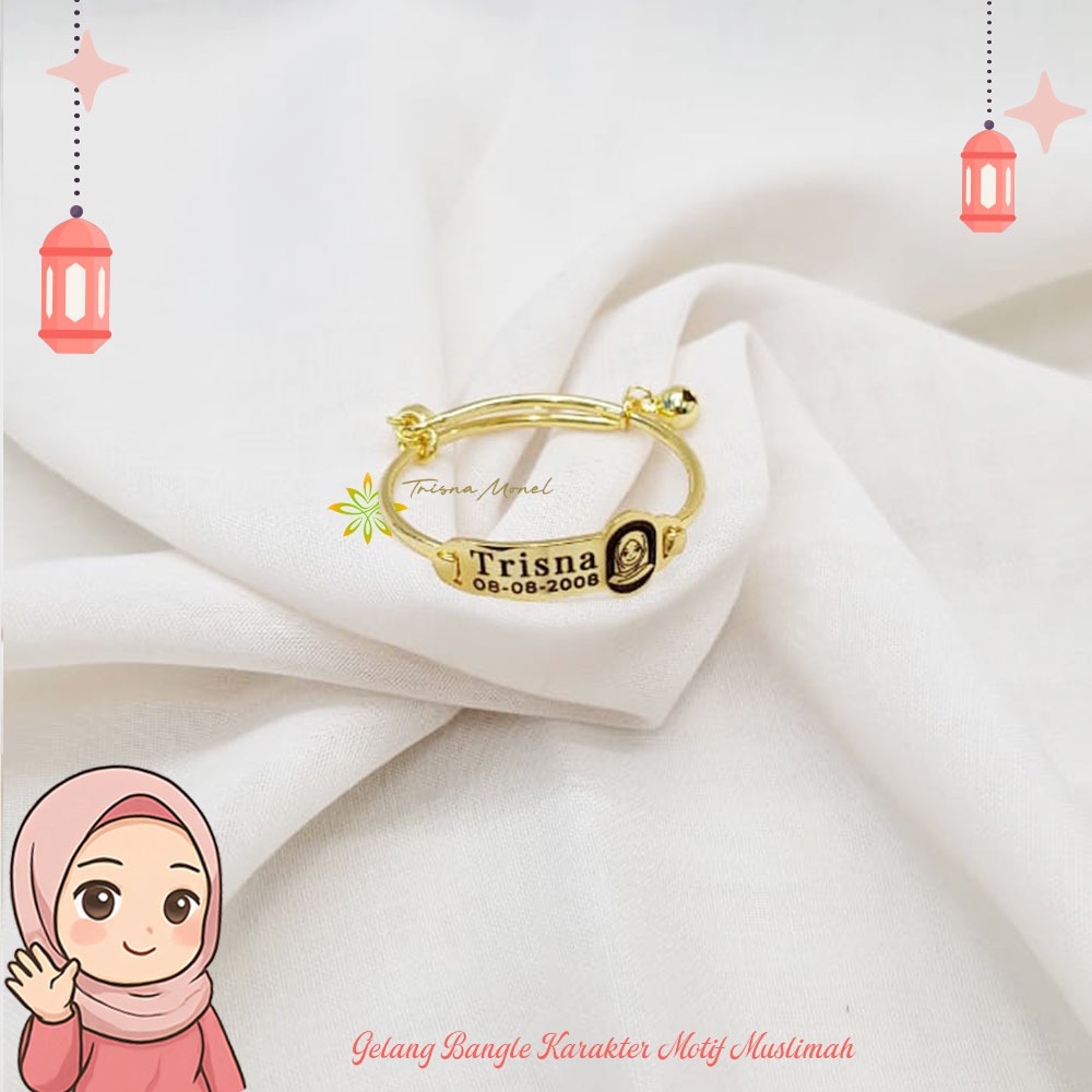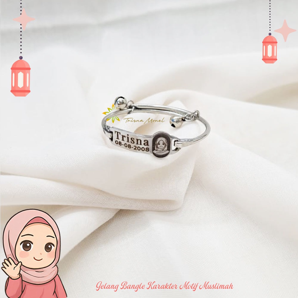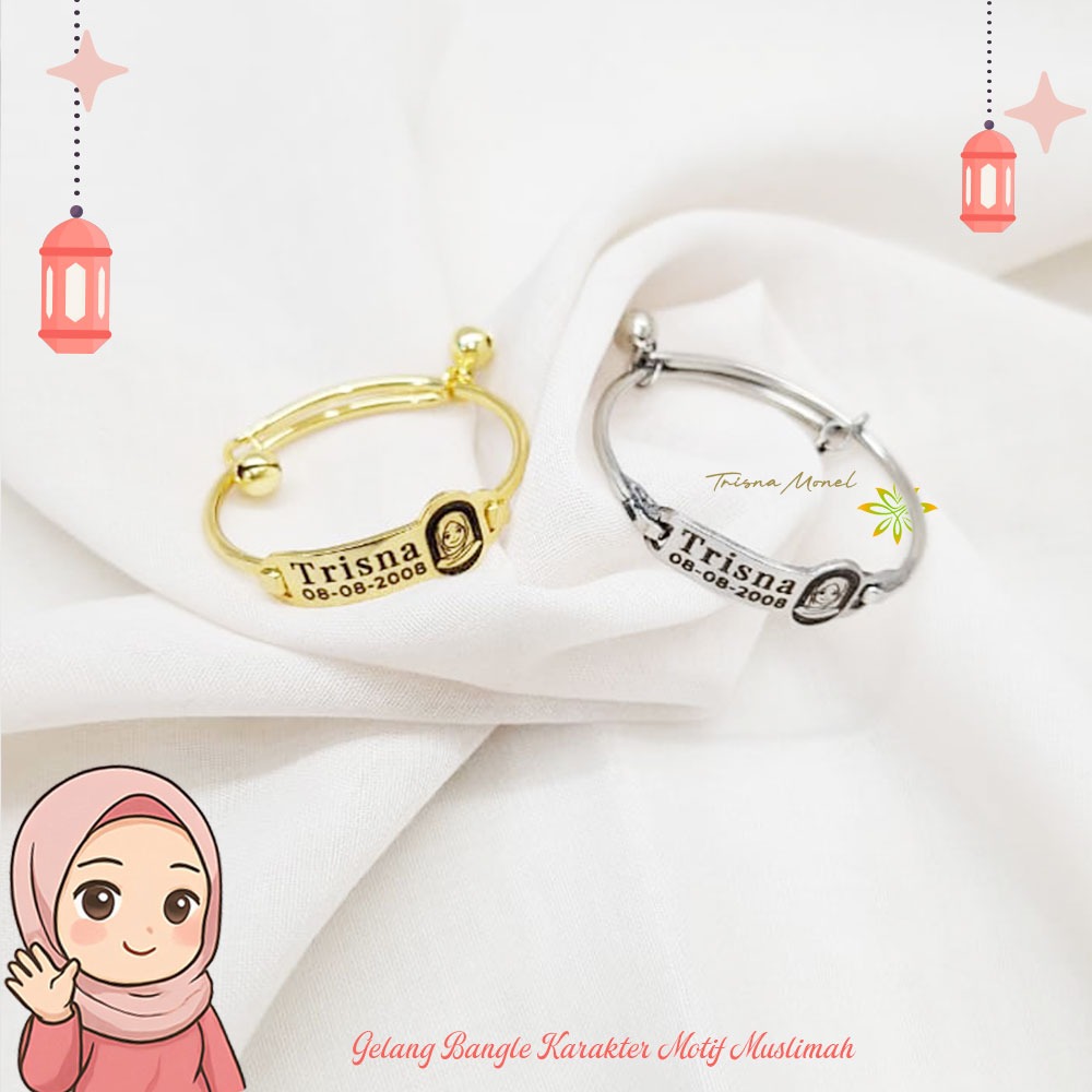 Adjustable free gelang monel !!! gelang karakter ukir nama size anak sampai dewasa motif kartun muslimah