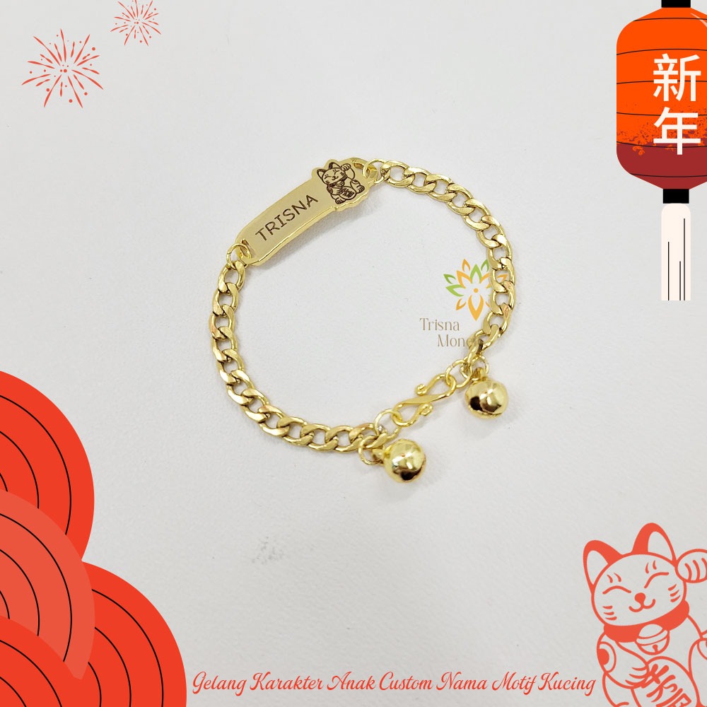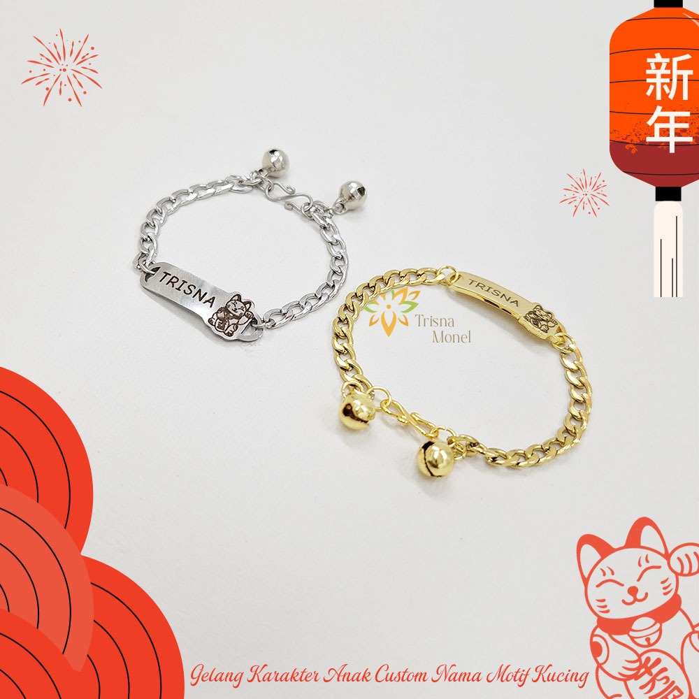 GELANG CUSTOM NAMA ANAK KARAKTER MOTIF KUCING GOLD DAN SILVER MURAH